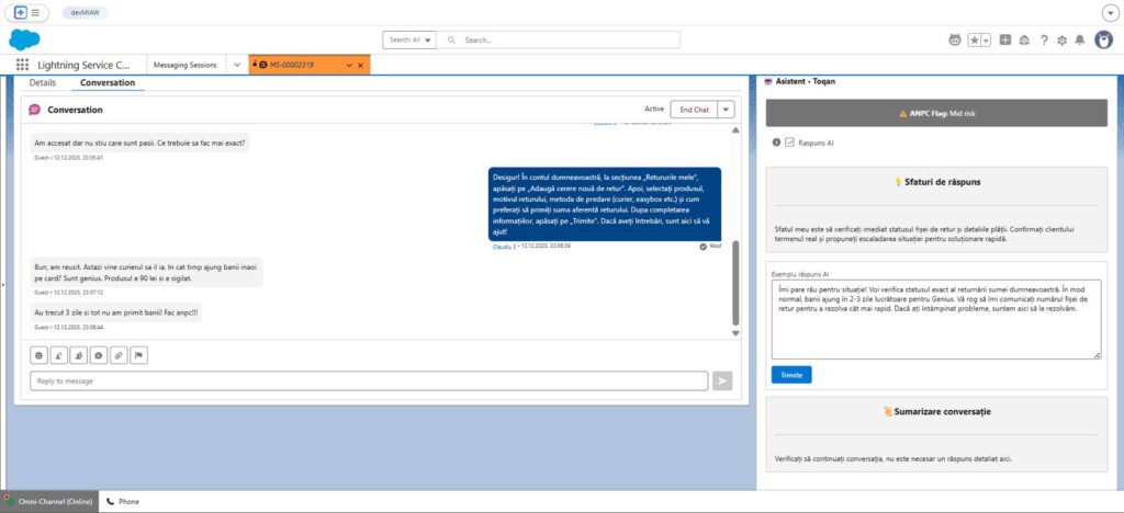 Acest component reduce semnificativ încărcarea cognitivă a agenților, oferind rezumate concise ale conversațiilor, sugestii acționabile și alerte de reglementare. Permite echipelor de suport să răspundă mai rapid, să mențină conformitatea și să ofere o experiență de client consistent de înaltă calitate.
